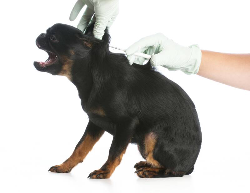 Voor veel honden is de eerste negatieve ervaring met de dierenarts de puppy enting en de bijhorende algehele controle. Zeker nu honden gechipt worden is de kans groot dat het krijgen van een injectie geassocieerd wordt met pijn en/of eng. Daarom is het goed om het injectie krijgen te trainen. Als eerste moet de hond of op commando kunnen staan of zitten en accepteren dat hij/zij lichtjes vastgehouden wordt. Zie oefening betasten. Als de hond nog niet getraind is om op de behandeltafel te staan is het beter de hond op de grond te laten en daar te enten.